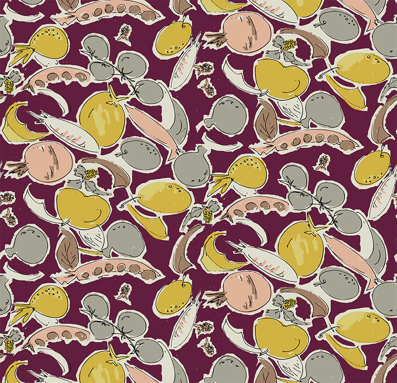 About the Print: Featuring beetroot, apples, peas and leeks, all vegetables and fruit that you could grow in most back gardens.